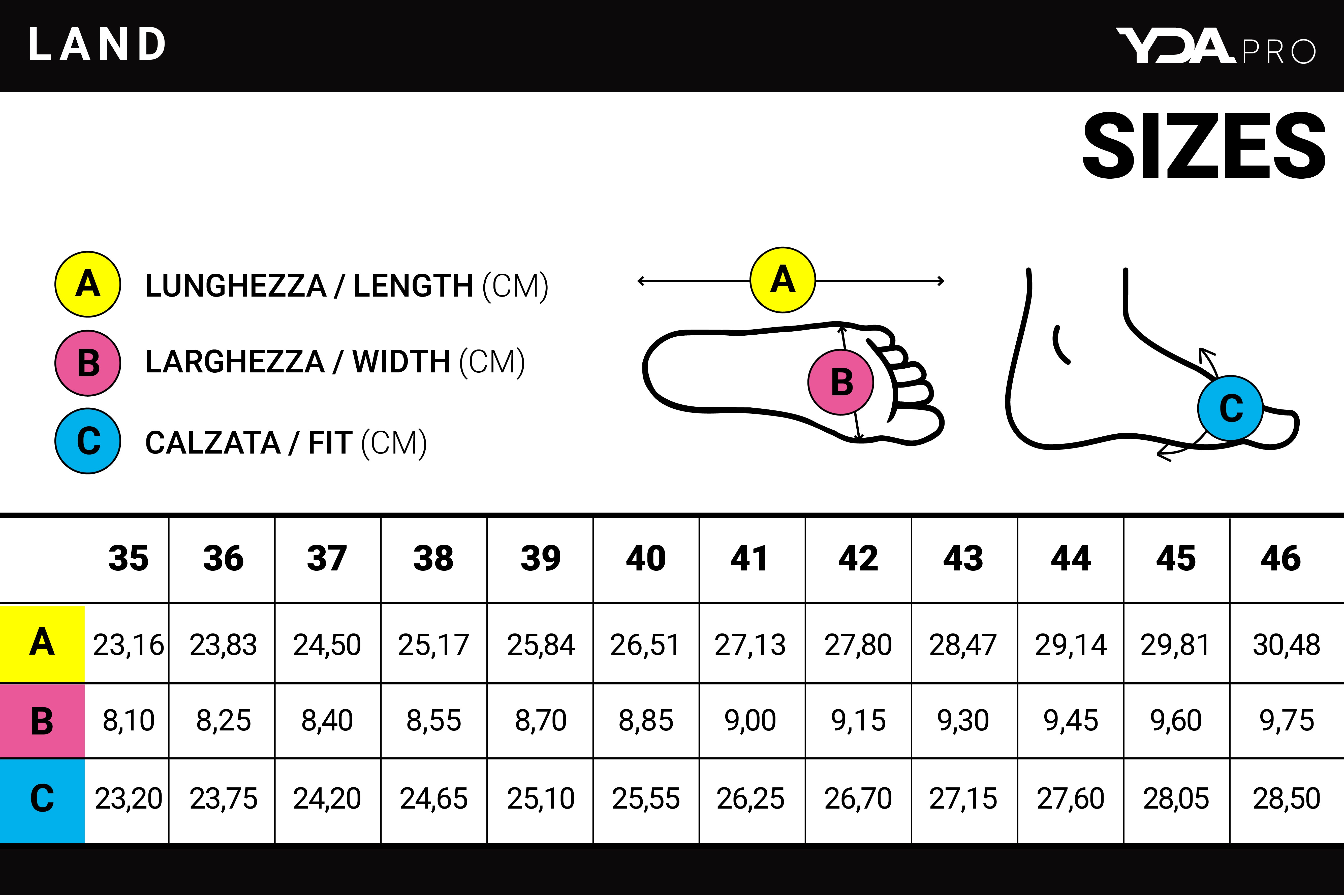 La sneaker Land si presenta con una morbida tomaia realizzata in pelle nera, soletta interna estraibile ed apertura regolabile con velcri. YDA consente di curare il bilanciamento della postura e potenziare le funzionalità del corpo. Il sistema antishock che ridistribuisce il peso sull’intera superficie plantare e lo Spring System favoriscono il rotolamento del piede restituendo una piacevole sensazione di benessere ed equilibrio.