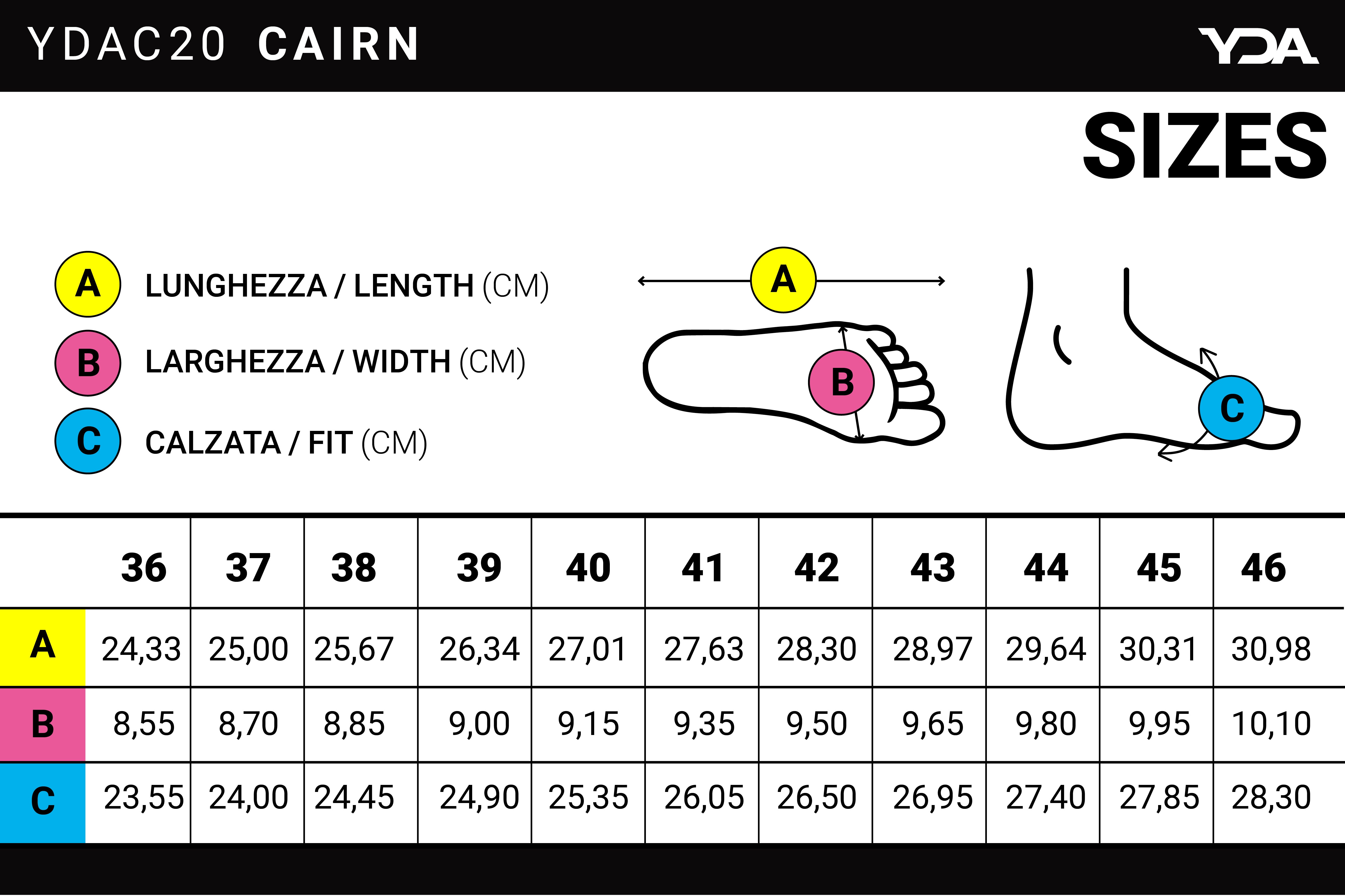 La sneaker Cairn C20, si presenta con una tomaia realizzata in tech-knit, soletta interna estraibile ed apertura easy lace. YDA consente di curare il bilanciamento della postura e potenziare le funzionalità del corpo. Il sistema antishock che ridistribuisce il peso sull’intera superficie plantare e lo Spring System favoriscono il rotolamento del piede restituendo una piacevole sensazione di benessere ed equilibrio.