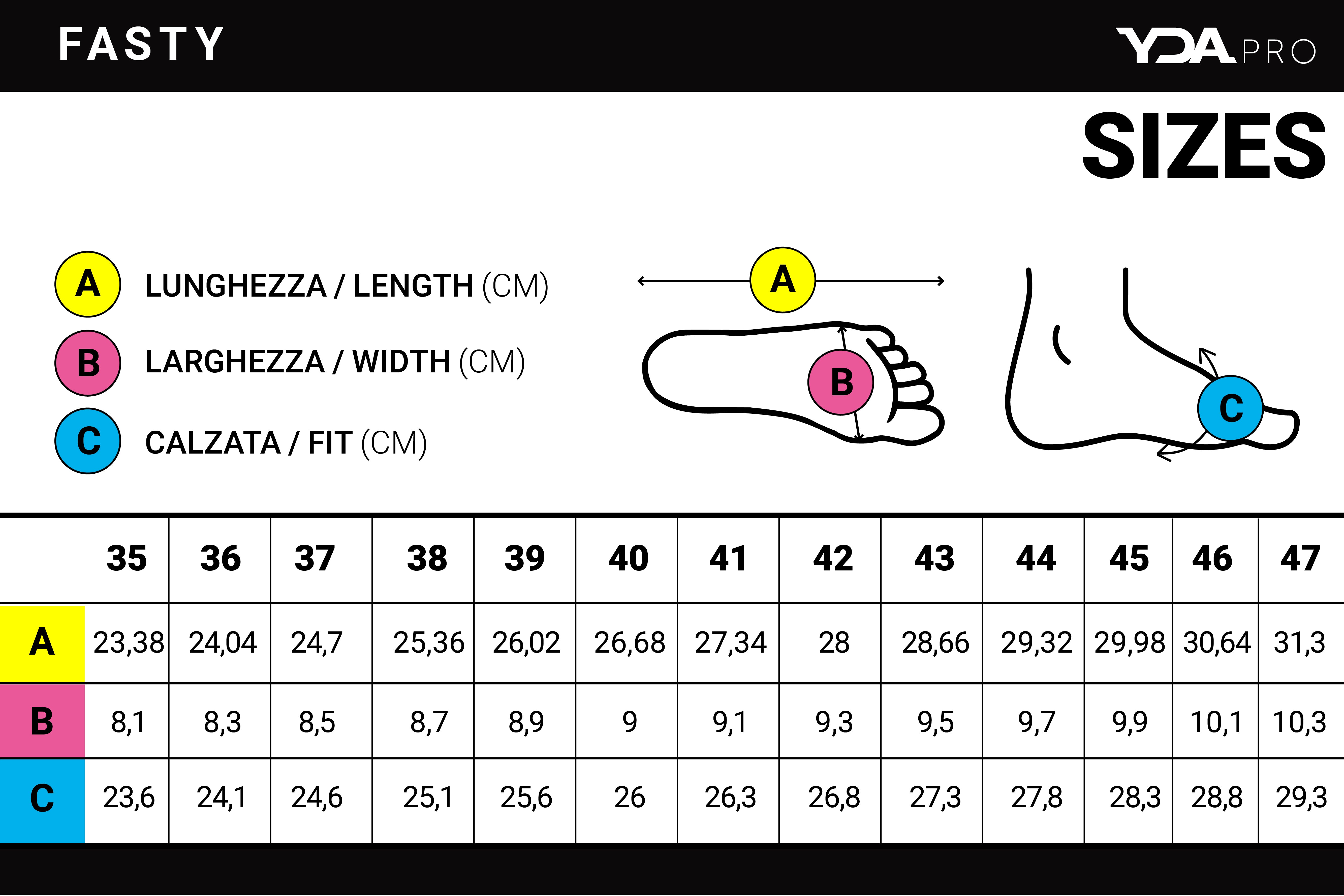 La sneaker Fasty si presenta con una tomaia realizzata in vera pelle nera con tecnologia 3D embossed ed apertura con lacci regolabili. YDA consente di curare il bilanciamento della postura e potenziare le funzionalità del corpo. Il sistema antishock che ridistribuisce il peso sull’intera superficie plantare e lo Spring System favoriscono il rotolamento del piede restituendo una piacevole sensazione di benessere ed equilibrio.